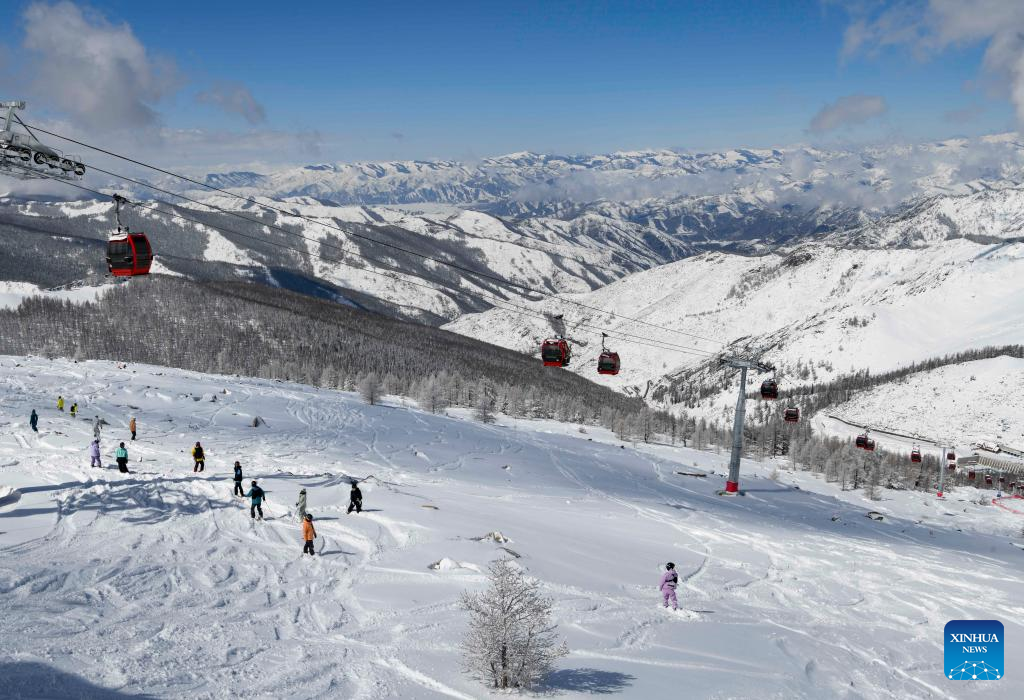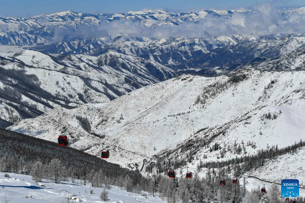 Cable cars run in the Altay Mountains in Koktokay, Fuyun County, northwest China's Xinjiang Uygur Autonomous Region, April 9, 2023. Koktokay in Xinjiang is rich in tourism resources. The international ski resort in Koktokay is very popular among tourists, which attracts snow lovers from all over the world to ski and enjoy the snow here. According to the ski resort, more than 128,000 visitors have visited the resort since March 2023. (Xinhua/Hu Huhu)