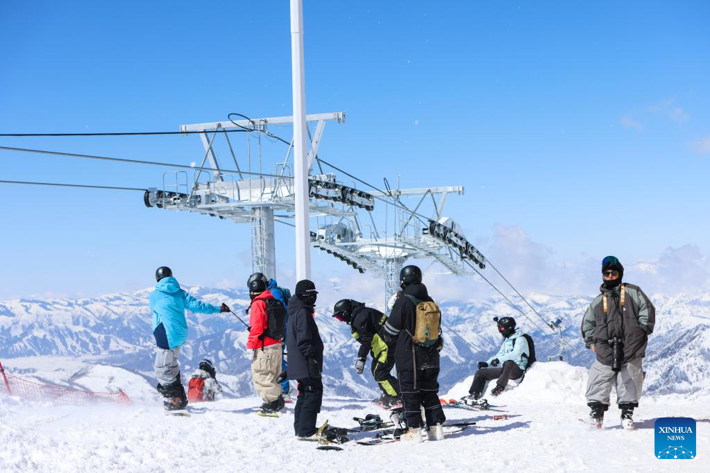 Visitors wait in line for cable cars at an international ski resort in Koktokay, Fuyun County, northwest China's Xinjiang Uygur Autonomous Region, April 9, 2023. Koktokay in Xinjiang is rich in tourism resources. The international ski resort in Koktokay is very popular among tourists, which attracts snow lovers from all over the world to ski and enjoy the snow here. According to the ski resort, more than 128,000 visitors have visited the resort since March 2023. (Xinhua/Hu Huhu)