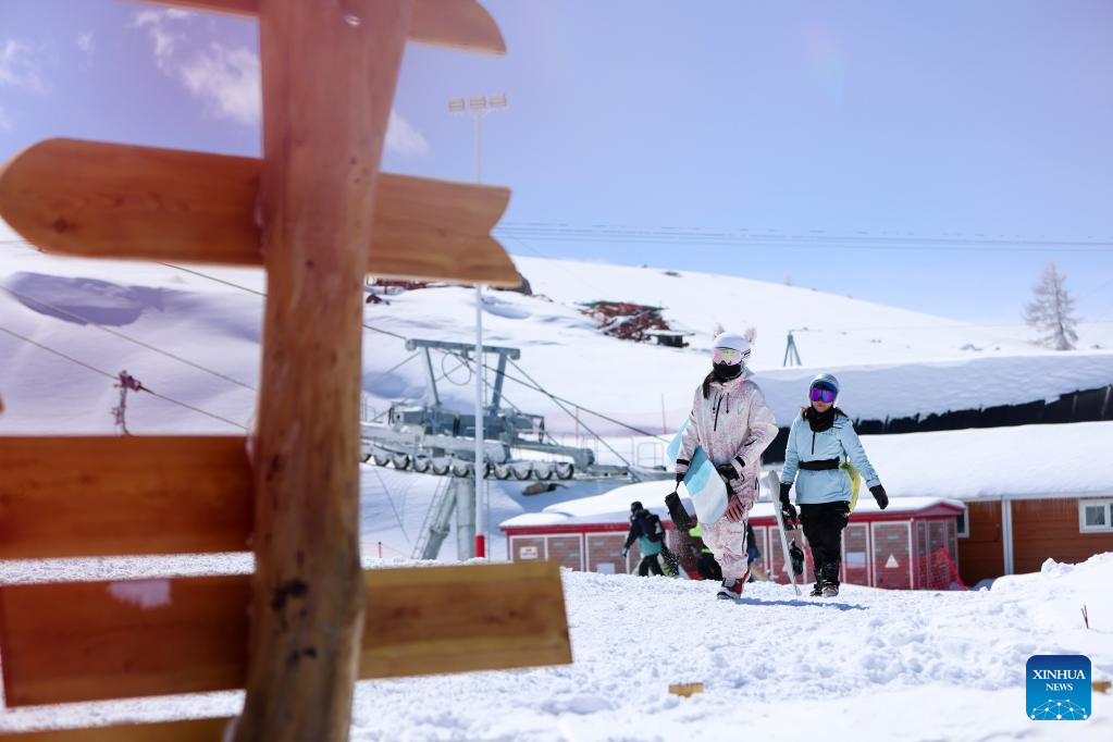 Tourists walk at an international ski resort in Koktokay, Fuyun County, northwest China's Xinjiang Uygur Autonomous Region, April 9, 2023. Koktokay in Xinjiang is rich in tourism resources. The international ski resort in Koktokay is very popular among tourists, which attracts snow lovers from all over the world to ski and enjoy the snow here. According to the ski resort, more than 128,000 visitors have visited the resort since March 2023. (Xinhua/Hu Huhu)