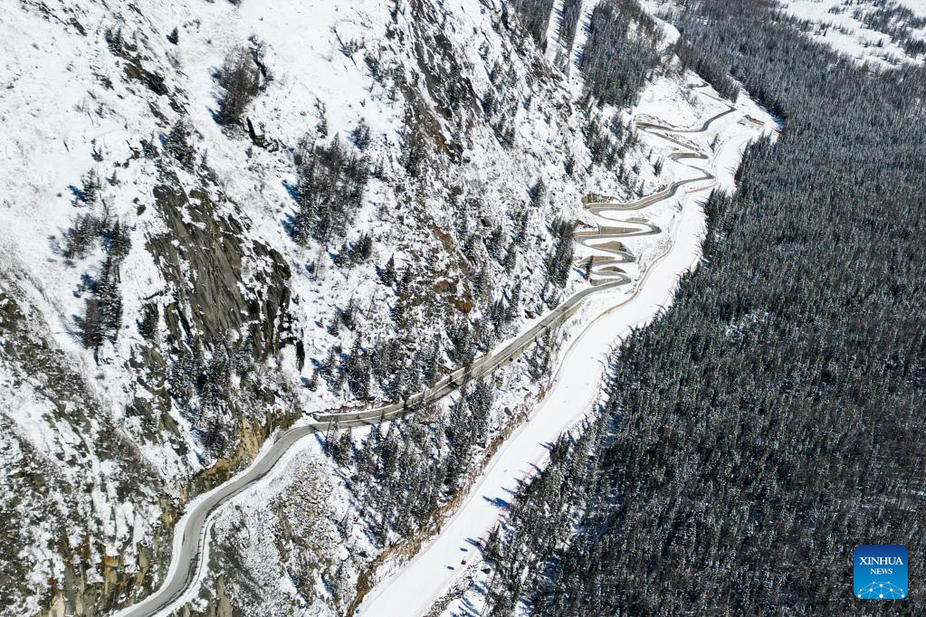 This aerial photo taken on April 9, 2023 shows the scenery of the snow mountains in Koktokay scenic area after spring snow in Fuyun County, northwest China's Xinjiang Uygur Autonomous Region. Koktokay in Xinjiang is rich in tourism resources. The international ski resort in Koktokay is very popular among tourists, which attracts snow lovers from all over the world to ski and enjoy the snow here. According to the ski resort, more than 128,000 visitors have visited the resort since March 2023. (Xinhua/Hao Zhao)