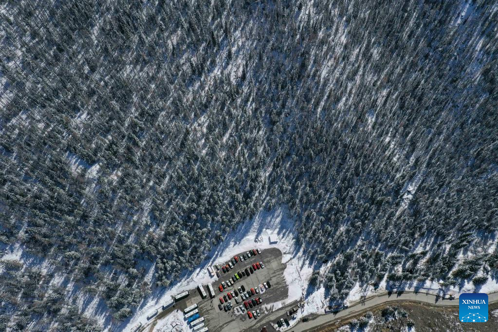 This aerial photo taken on April 9, 2023 shows cars parking at a cableway station of an international ski resort in Koktokay, Fuyun County, northwest China's Xinjiang Uygur Autonomous Region. Koktokay in Xinjiang is rich in tourism resources. The international ski resort in Koktokay is very popular among tourists, which attracts snow lovers from all over the world to ski and enjoy the snow here. According to the ski resort, more than 128,000 visitors have visited the resort since March 2023. (Xinhua/Hu Huhu)