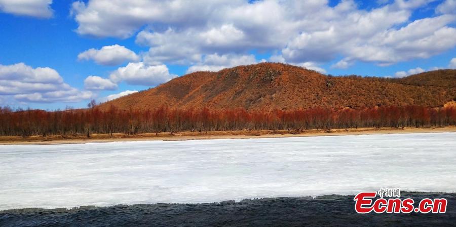 Red willows flourish on the banks of the Nuomin River with the arrival of spring in north China’s Inner Mongolia Autonomous Region. The red willows and the half-frozen river present a beautiful scene in April. (Photo: China News Service/Jiang Xiwu)