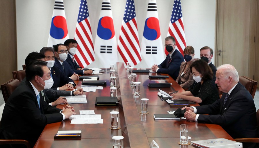 South Korean President Yoon Suk-yeol (1st L) and U.S. President Joe Biden (1st R) hold their first summit talks in Seoul, South Korea, May 21, 2022. (NEWSIS/Handout via Xinhua)