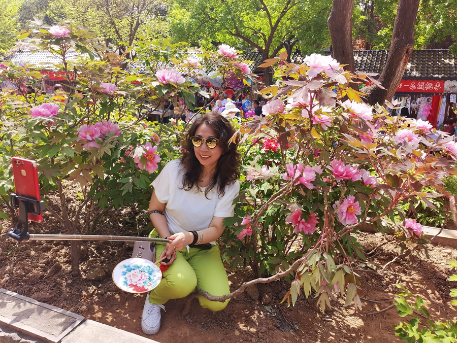 A tourist poses for a selfie at the National Peony Garden in Luoyang, central China's Henan Province, April 10, 2023. (People’s Daily Online/Du Mingming)