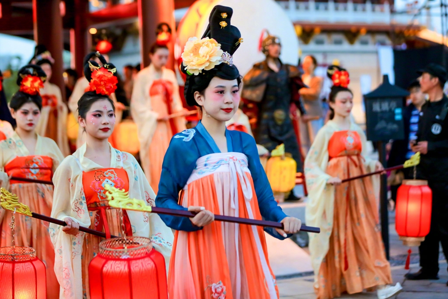 Photo shows a Hanfu show at the Jiuzhou Pond Scenic Area in Luoyang city, central China's Henan Province. (Photo courtesy of Jiuzhou Pond Scenic Area)
