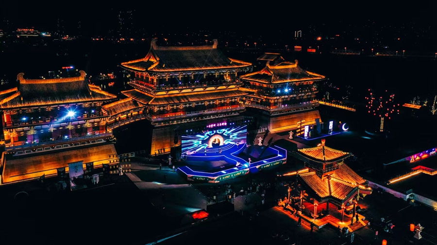 Photo shows a night view of the Jiuzhou Pond Scenic Area in Luoyang city, central China's Henan Province. (Photo courtesy of Jiuzhou Pond Scenic Area)