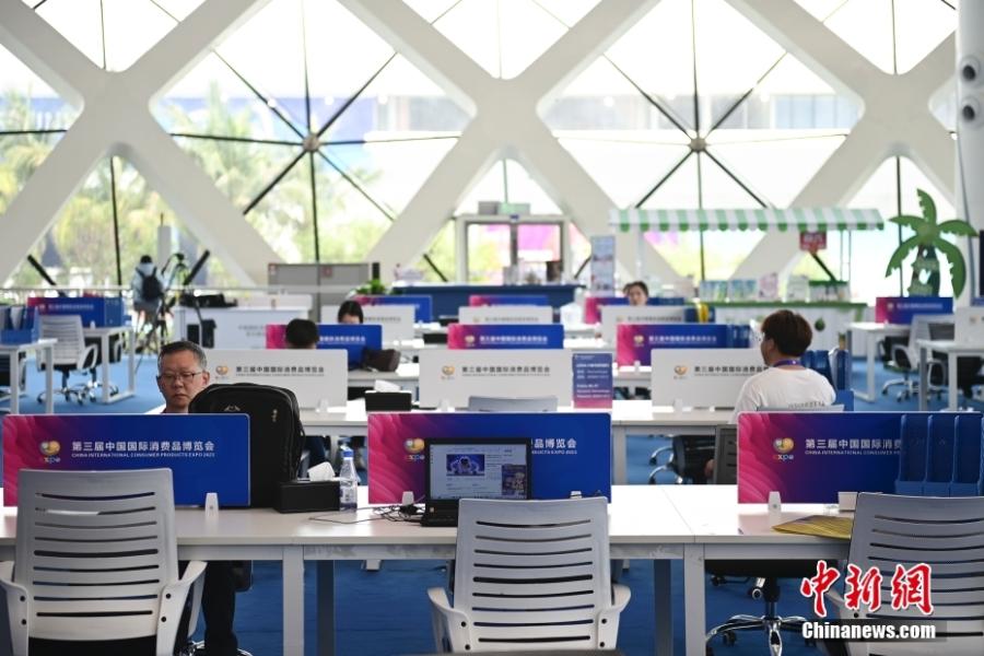 Journalists work at the media center of the 3rd China International Consumer Products Expo in Haikou, south China's Hainan Province, April 10, 2023. (Photo: China News Service/Tian Yuhao)