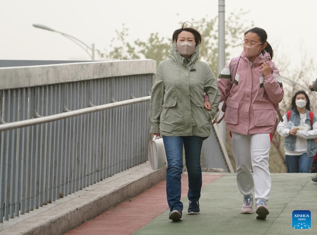 People wearing masks walk on an overpass in Haidian District of Beijing, capital of China, April 11, 2023. Floating sand and dust affected Beijing on Tuesday. (Xinhua/Ren Chao)