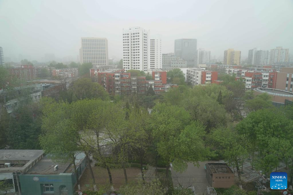 This photo taken on April 11, 2023 shows buildings shrouded in dust in Haidian District of Beijing, capital of China. Floating sand and dust affected Beijing on Tuesday. (Xinhua/Ren Chao)