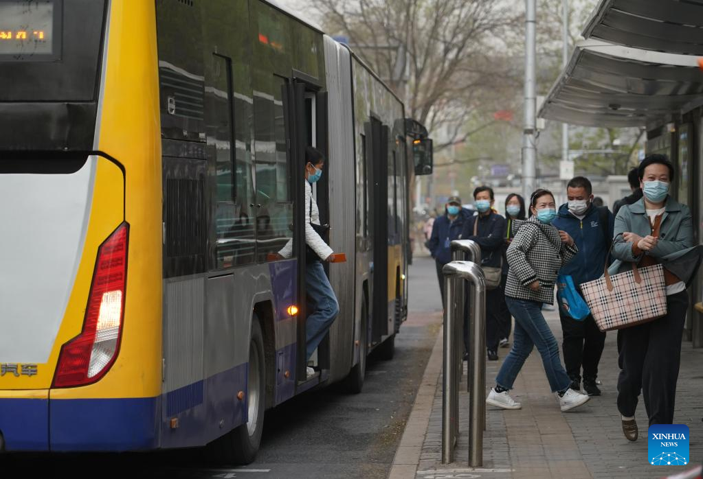 This photo taken on April 11, 2023 shows a bus station in Haidian District of Beijing, capital of China. Floating sand and dust affected Beijing on Tuesday. (Xinhua/Ren Chao)