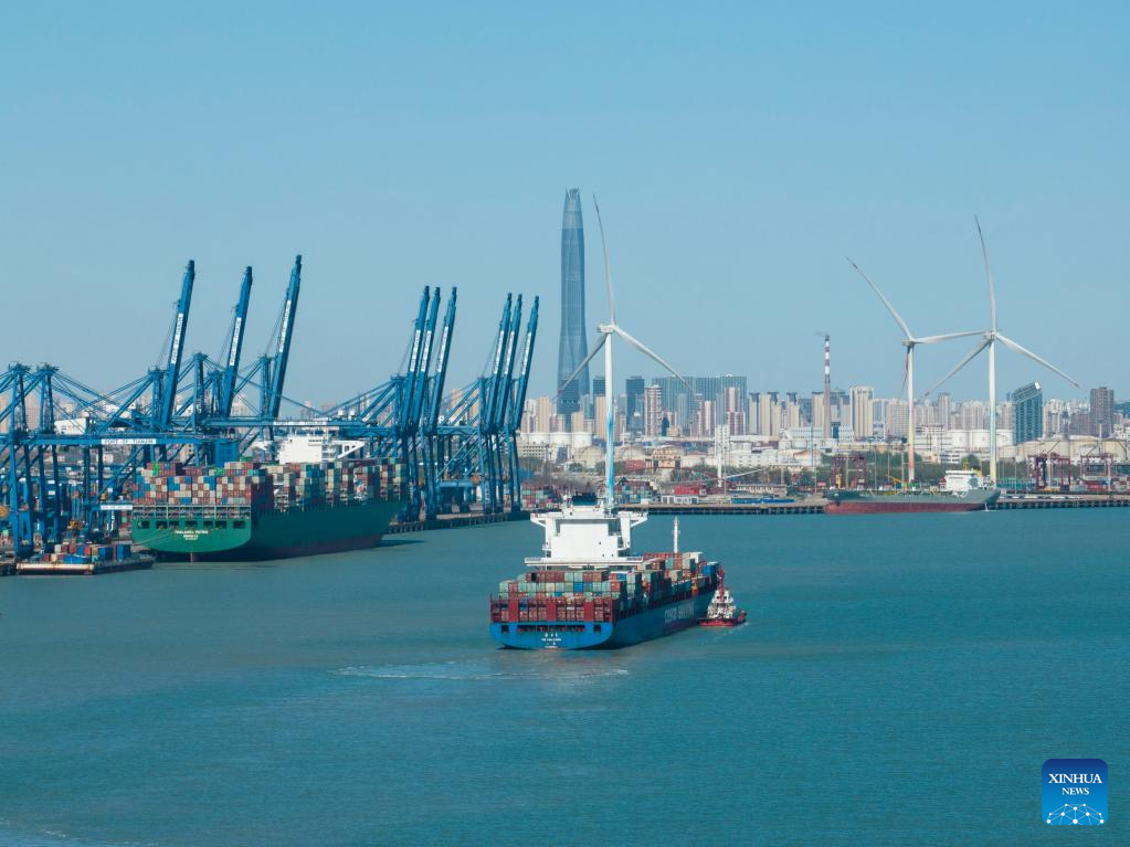 This aerial photo taken on April 7, 2023 shows a container ship sailing at Tianjin Port in north China's Tianjin. North China's Tianjin Port handled approximately 5.047 million twenty-foot equivalent units (TEUs) of containers in the first three months of 2023, up 9.09 percent year on year. (Photo by Han Xilong/Xinhua)
