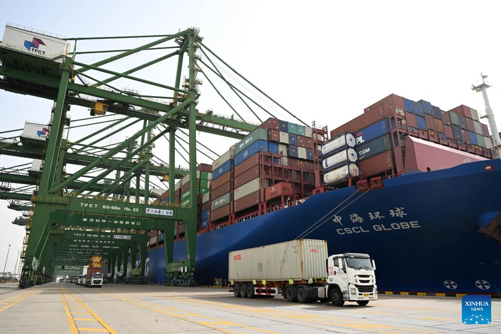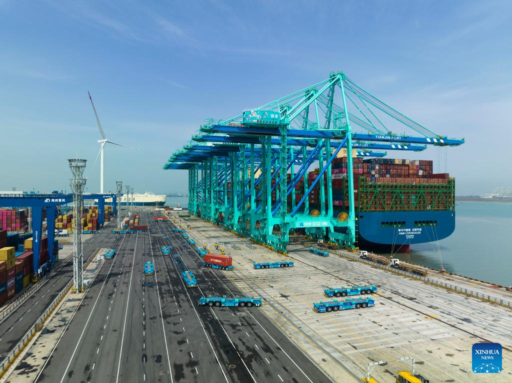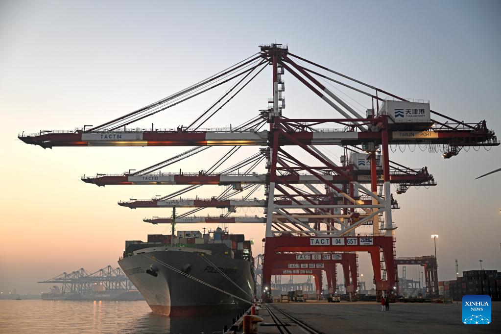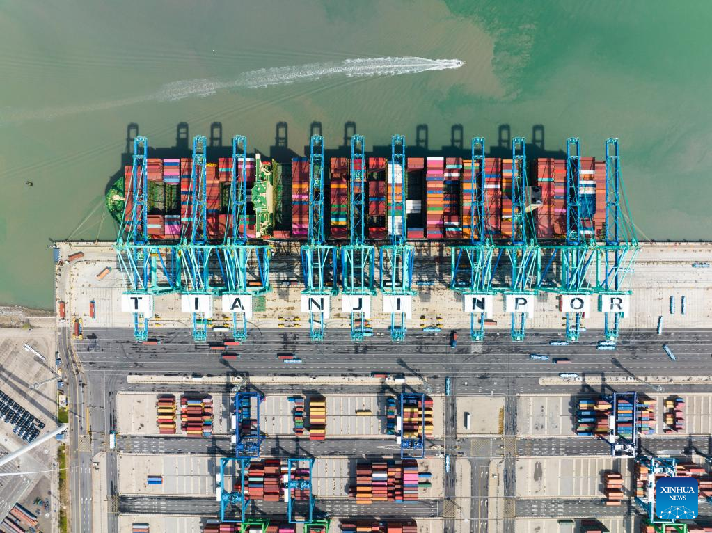 This photo taken on Jan. 1, 2023 shows a container ship at Tianjin Port in north China's Tianjin. North China's Tianjin Port handled approximately 5.047 million twenty-foot equivalent units (TEUs) of containers in the first three months of 2023, up 9.09 percent year on year. (Xinhua/Zhao Zishuo)
