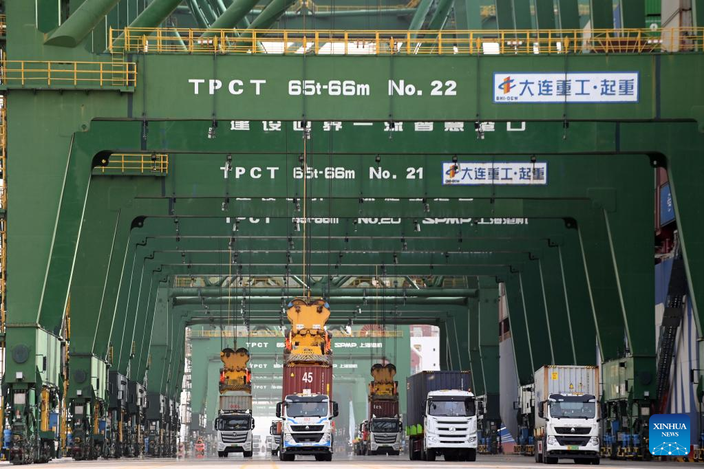 Containers are transported by trucks at the Pacific international container terminal of Tianjin Port in north China's Tianjin, April 11, 2023. North China's Tianjin Port handled approximately 5.047 million twenty-foot equivalent units (TEUs) of containers in the first three months of 2023, up 9.09 percent year on year. (Xinhua/Zhao Zishuo)