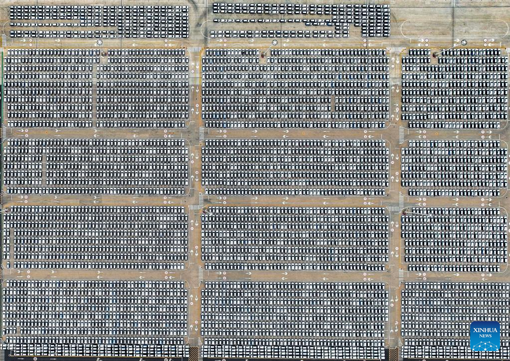 This aerial photo taken on April 10, 2023 shows cars waiting to be loaded to the ships at Tianjin Port in north China's Tianjin. North China's Tianjin Port handled approximately 5.047 million twenty-foot equivalent units (TEUs) of containers in the first three months of 2023, up 9.09 percent year on year. (Photo by Xia Desong/Xinhua)