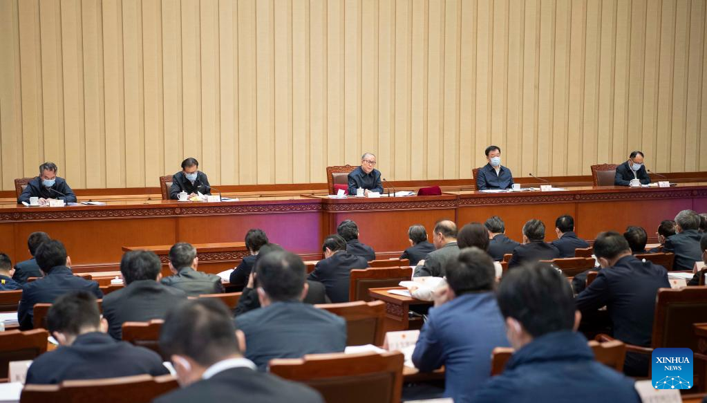 Li Hongzhong, a member of the Political Bureau of the Central Committee of the Communist Party of China and vice chairman of the National People's Congress (NPC) Standing Committee, speaks during a meeting on the handling of suggestions made during the first session of the 14th NPC in Beijing, capital of China, April 11, 2023. (Xinhua/Li Tao)