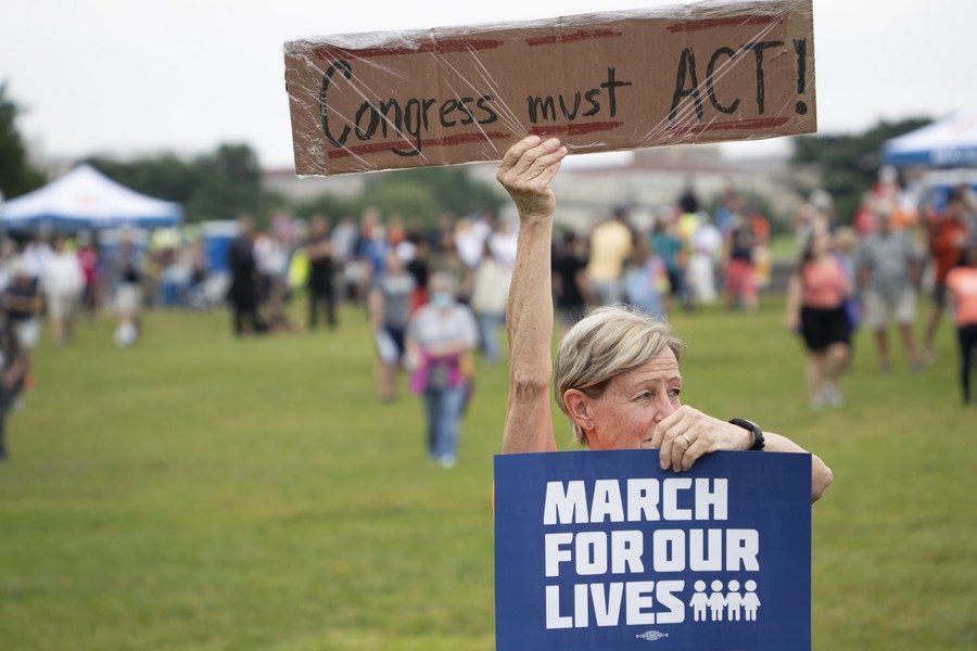 People gather during a rally decrying rising gun violence while urging politicians to take action in Washington, D.C., the United States, June 11, 2022. (Xinhua/Liu Jie)