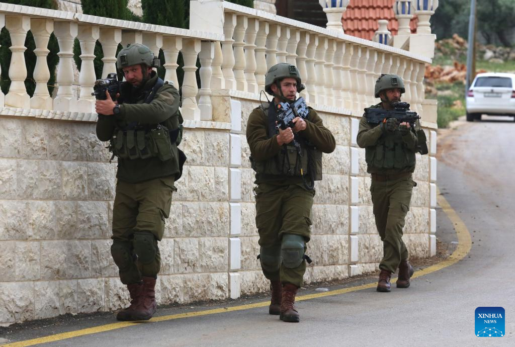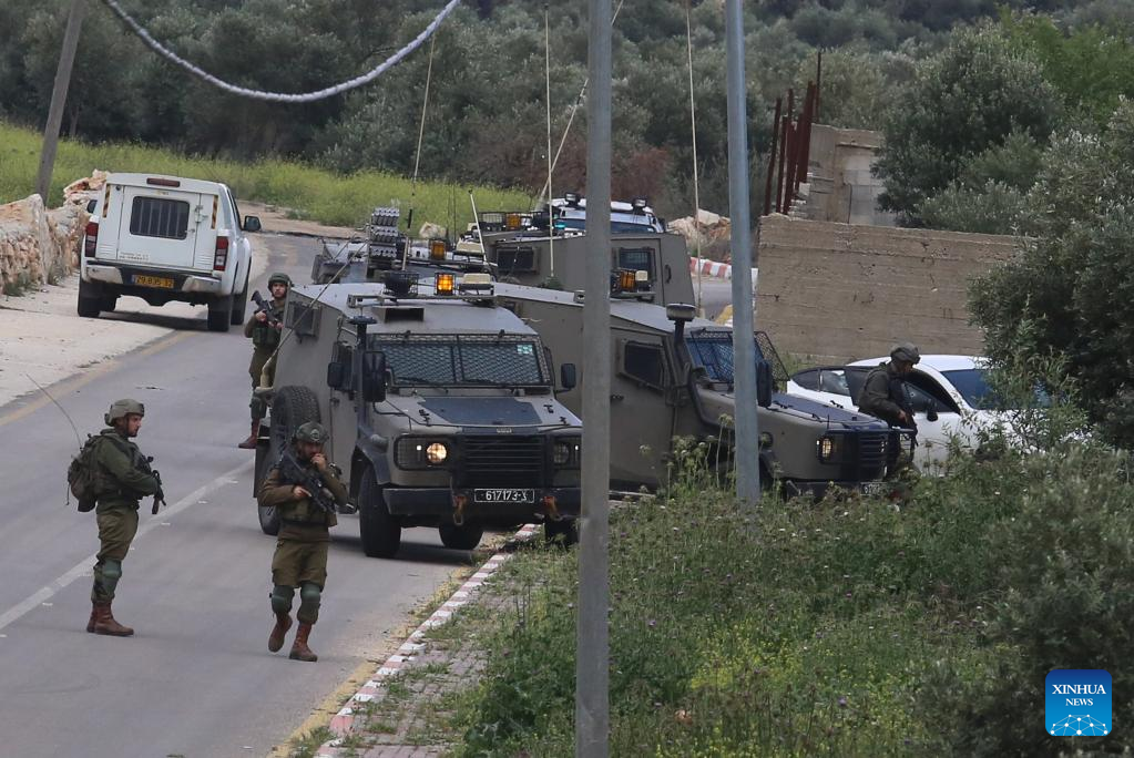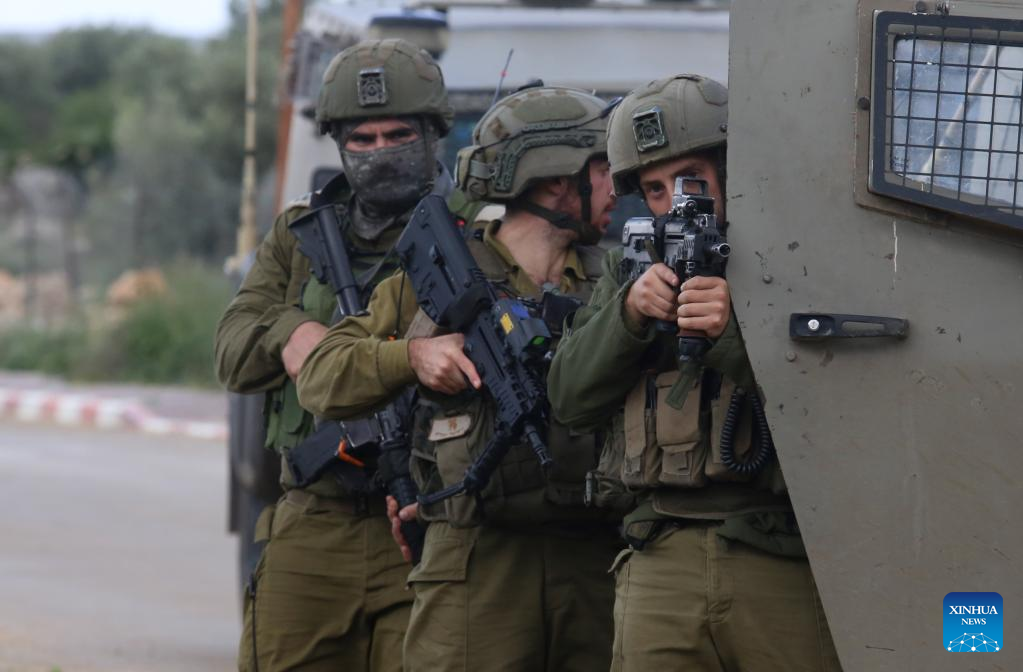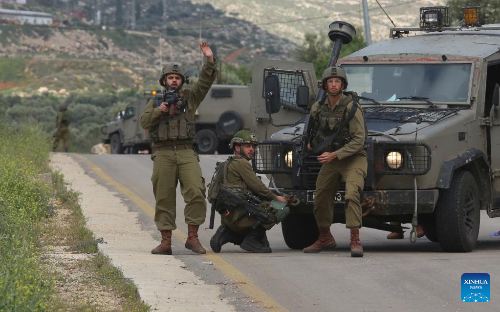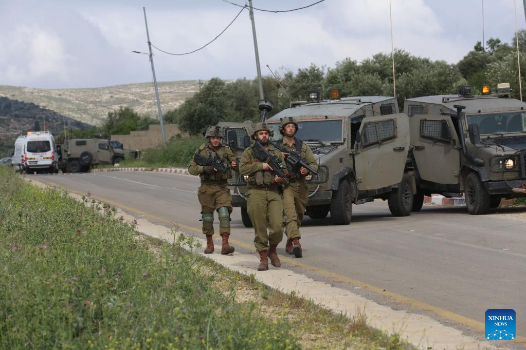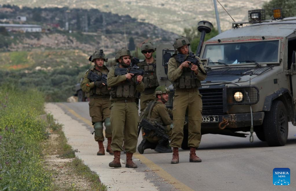 Israeli soldiers are seen near the scene where two Palestinians were killed near an Israeli settlement northeast of the West Bank city of Nablus, on April 11, 2023. Two Palestinian militants were killed on Tuesday in an exchange of fire near an Israeli settlement northeast of the West Bank city of Nablus, Palestinian and Israeli sources said. (Photo by Nidal Eshtayeh/Xinhua)