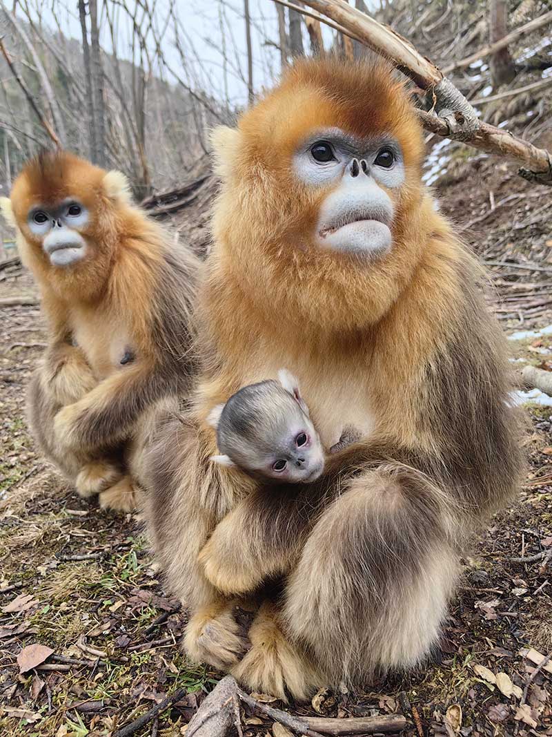 A female golden snub-nosed monkey holds her newborn cub in her arms. (Photo/Huang Tianpeng)