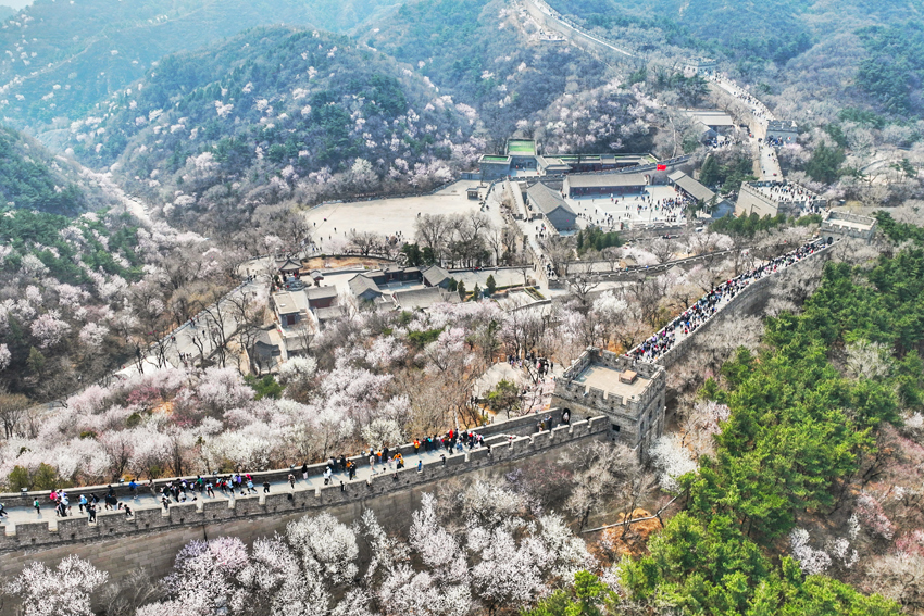 In recent days, wild peach and apricot flowers have been in full bloom in Yanqing district, Beijing, encircling the Badaling section of the Great Wall and the mountains with bewilderingly charming beauty.