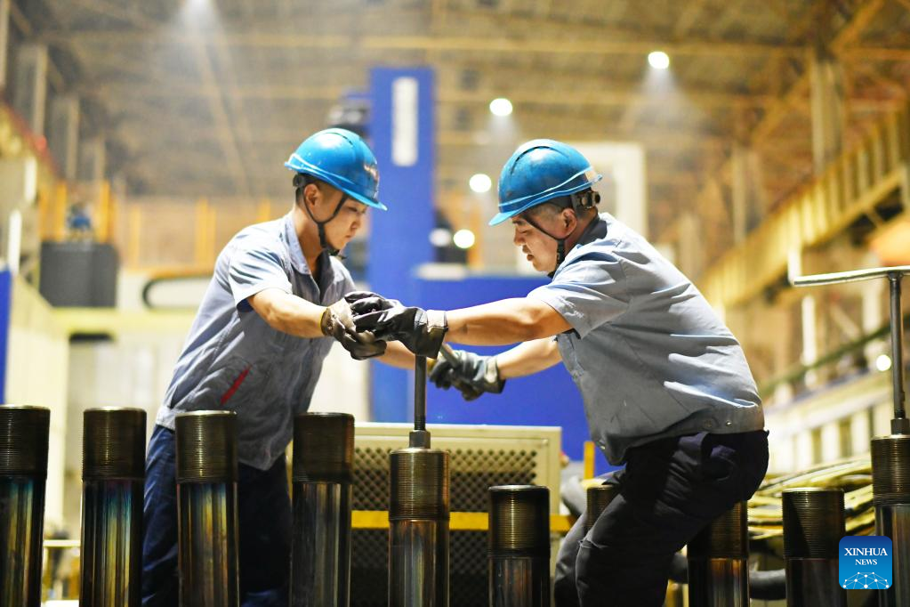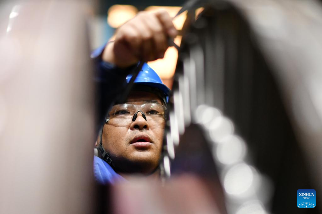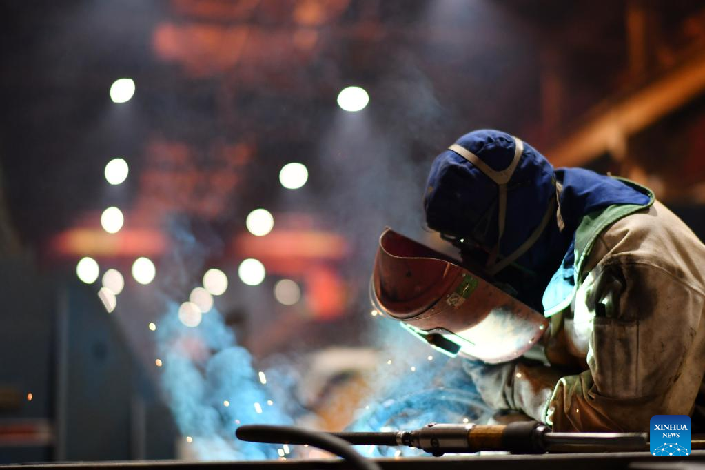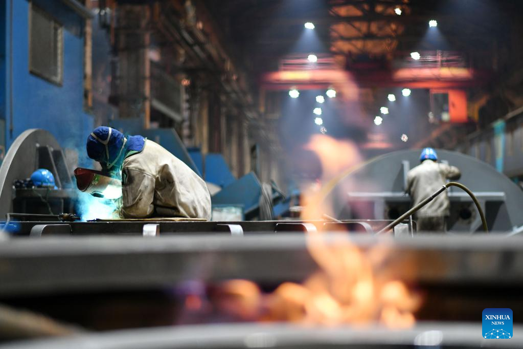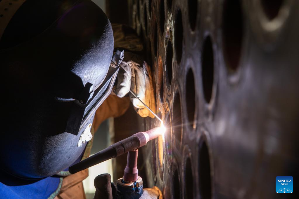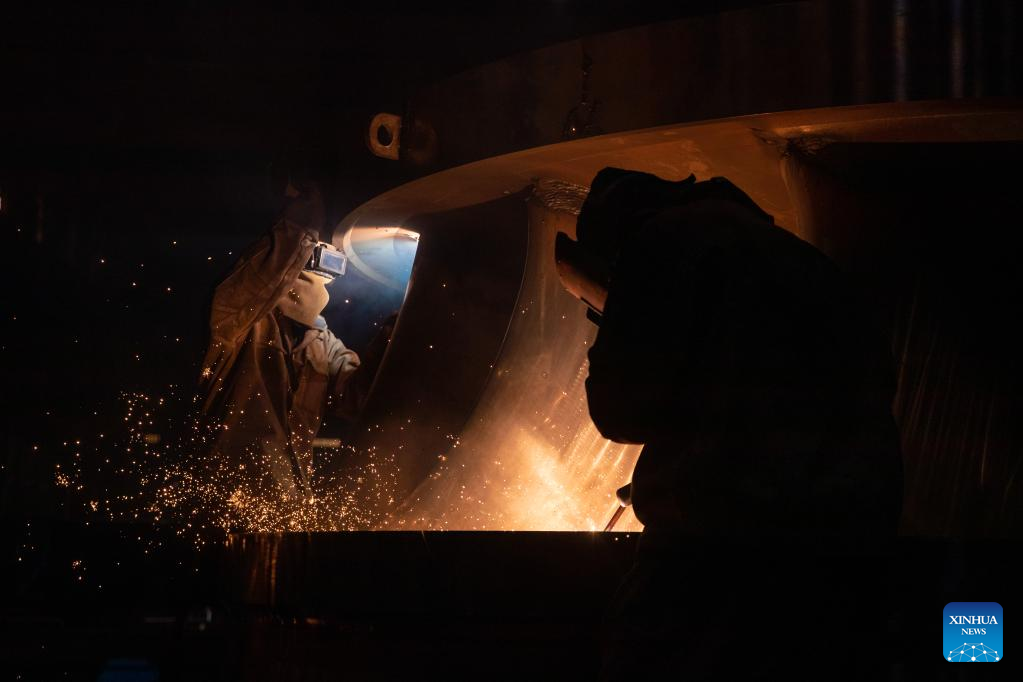 A worker performs production tasks at Harbin Boiler Company Limited of Harbin Electric Corporation in Harbin, northeast China's Heilongjiang Province, April 12, 2023. Harbin Electric Corporation, a veteran state-owned enterprise with a history of over 70 years, has been hailed as the cradle of China's power generation equipment manufacturing industry. The enterprise has been promoting high-quality development and remains a leading player in the industry. In the first quarter of 2023, Harbin Electric Corporation achieved a strong start with a year-on-year increase of 22.2 percent in operating income, a year-on-year increase of 170 percent in total profits, and a year-on-year increase of 62.7 percent in the number of formal contracts signed. (Xinhua/Zhang Tao)