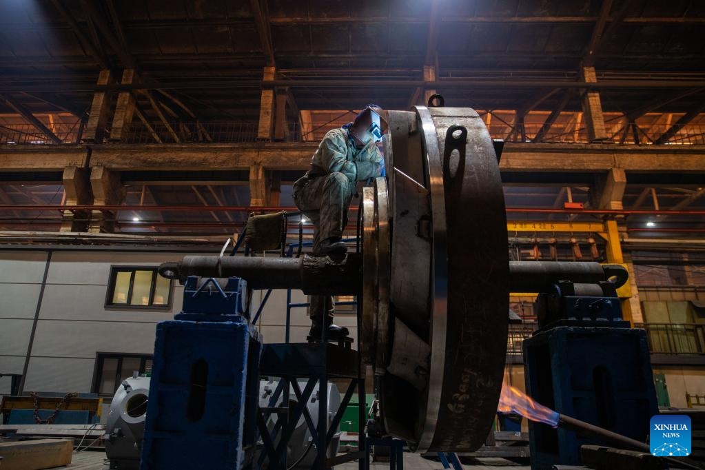 A worker performs production tasks at Harbin Turbine Company Limited of Harbin Electric Corporation in Harbin, capital of northeast China's Heilongjiang Province, April 10, 2023. Harbin Electric Corporation, a veteran state-owned enterprise with a history of over 70 years, has been hailed as the cradle of China's power generation equipment manufacturing industry. The enterprise has been promoting high-quality development and remains a leading player in the industry. In the first quarter of 2023, Harbin Electric Corporation achieved a strong start with a year-on-year increase of 22.2 percent in operating income, a year-on-year increase of 170 percent in total profits, and a year-on-year increase of 62.7 percent in the number of formal contracts signed. (Xinhua/Wang Jianwei)
