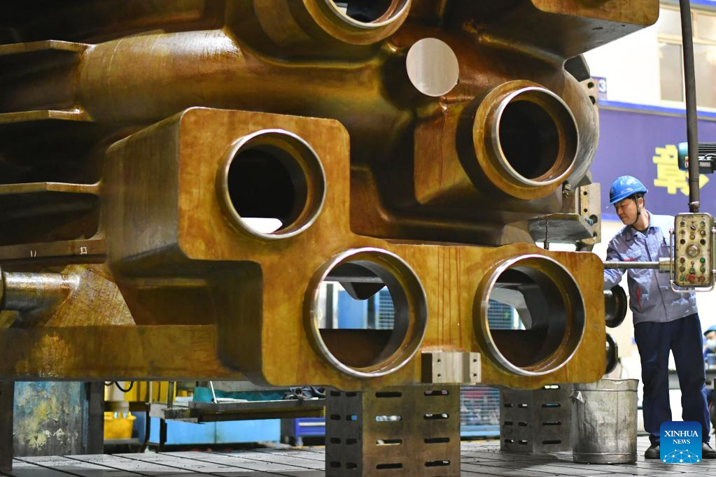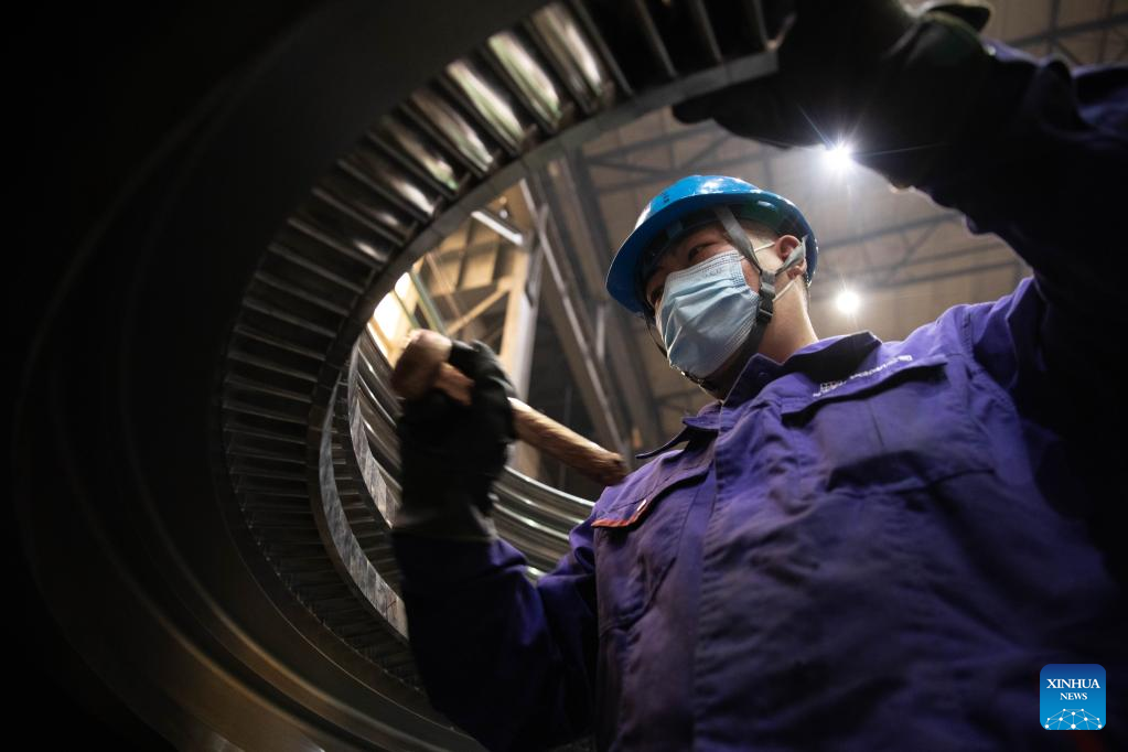 A worker performs production tasks at Harbin Turbine Company Limited of Harbin Electric Corporation in Harbin, capital of northeast China's Heilongjiang Province, April 10, 2023. Harbin Electric Corporation, a veteran state-owned enterprise with a history of over 70 years, has been hailed as the cradle of China's power generation equipment manufacturing industry. The enterprise has been promoting high-quality development and remains a leading player in the industry. In the first quarter of 2023, Harbin Electric Corporation achieved a strong start with a year-on-year increase of 22.2 percent in operating income, a year-on-year increase of 170 percent in total profits, and a year-on-year increase of 62.7 percent in the number of formal contracts signed. (Xinhua/Zhang Tao)