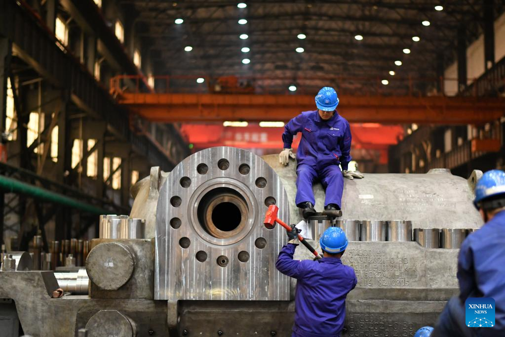 Workers perform production tasks at Harbin Turbine Company Limited of Harbin Electric Corporation in Harbin, capital of northeast China's Heilongjiang Province, April 10, 2023. Harbin Electric Corporation, a veteran state-owned enterprise with a history of over 70 years, has been hailed as the cradle of China's power generation equipment manufacturing industry. The enterprise has been promoting high-quality development and remains a leading player in the industry. In the first quarter of 2023, Harbin Electric Corporation achieved a strong start with a year-on-year increase of 22.2 percent in operating income, a year-on-year increase of 170 percent in total profits, and a year-on-year increase of 62.7 percent in the number of formal contracts signed. (Xinhua/Wang Jianwei)