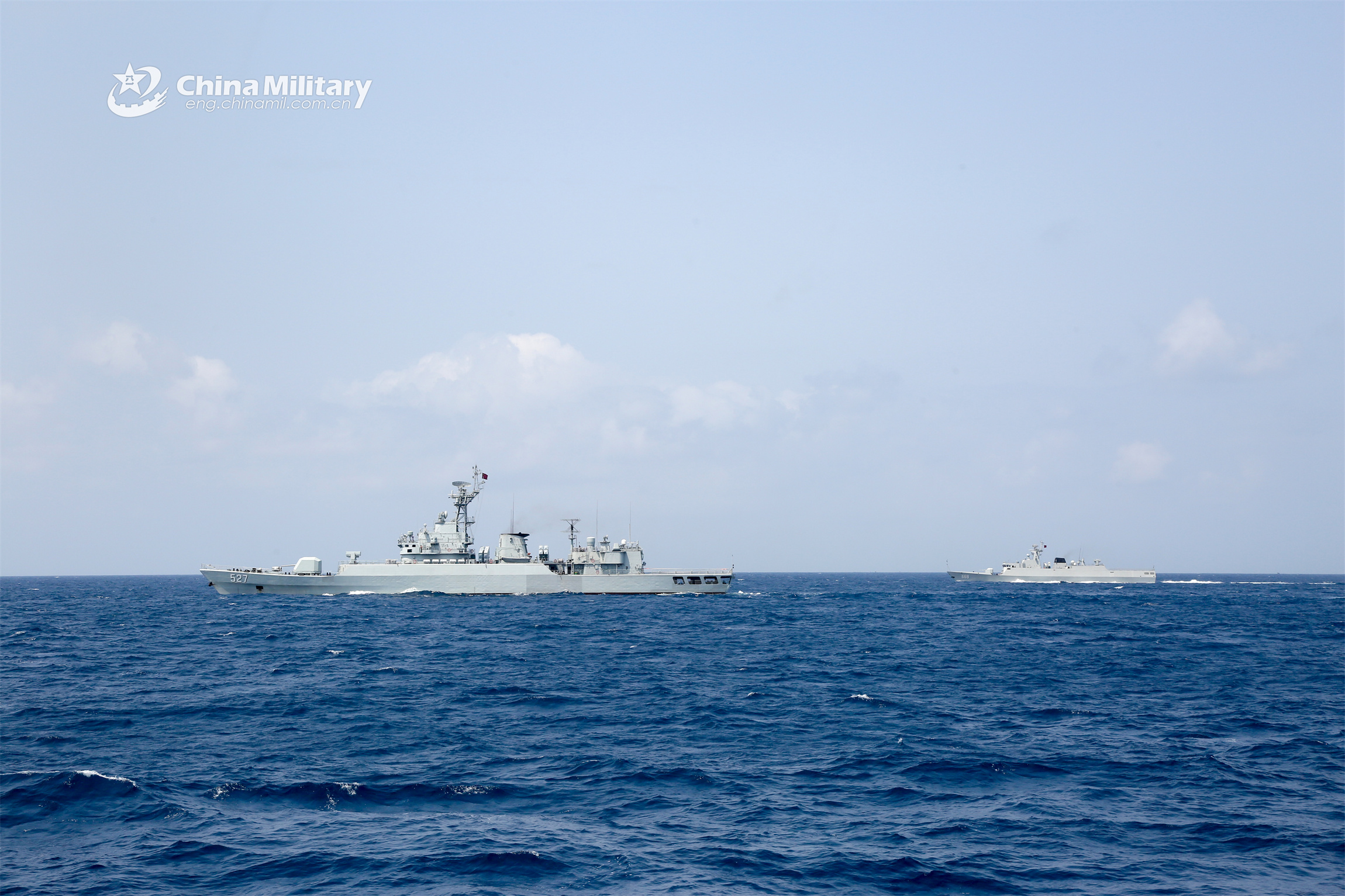Vessels attached to a frigate flotilla with the navy under the PLA Southern Theater Command sail toward the designated site during a recent maritime training exercise. (eng.chinamil.com.cn/Photo by Zhang Weifeng)