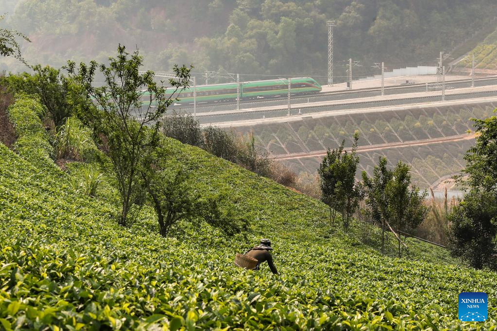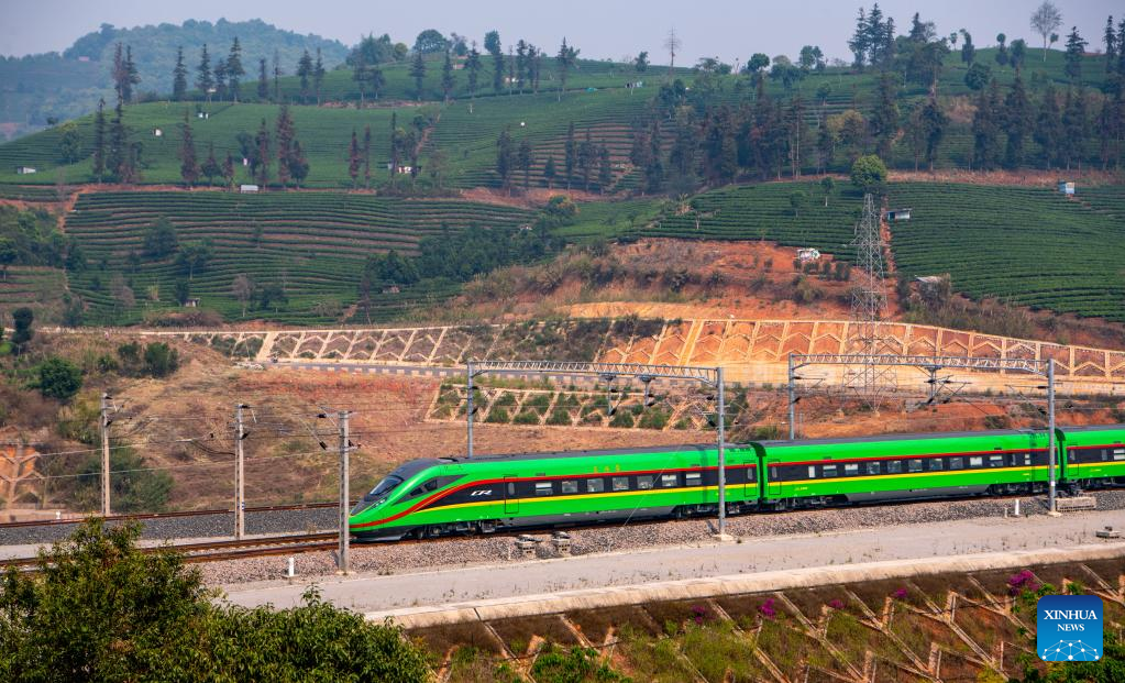 The first cross-border passenger train from Kunming, southwest China's Yunnan Province to the Lao capital Vientiane passes by tea plantations in Pu'er, southwest China's Yunnan Province, April 13, 2023. The China-Laos Railway started cross-border passenger services on Thursday, a move that is expected to boost regional connectivity. (Xinhua/Jiang Wenyao)