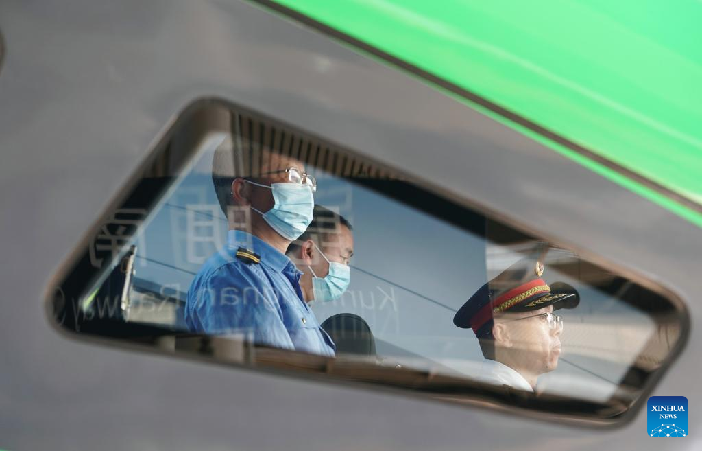 Crew members of a passenger train bound for the Lao capital Vientiane prepare for departure from Kunming South Railway Station in Kunming, southwest China's Yunnan Province, April 13, 2023. (Xinhua/Xing Guangli)
