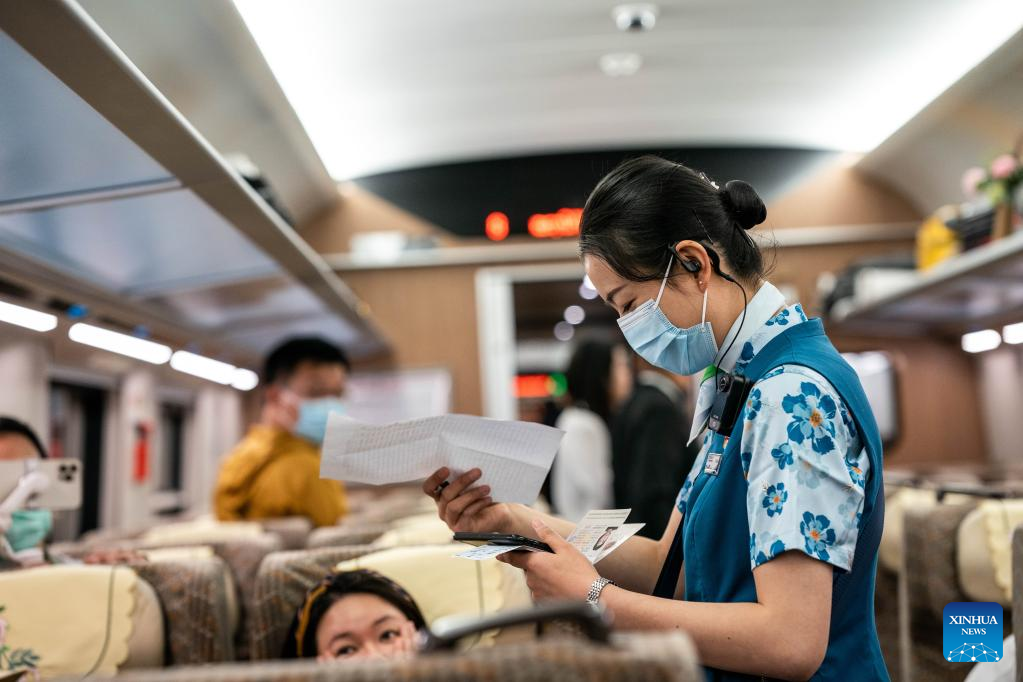 A passenger shows her ticket aboard the first cross-border passenger train from Kunming, southwest China's Yunnan Province to the Lao capital Vientiane on April 13, 2023. The China-Laos Railway started cross-border passenger services on Thursday, a move that is expected to boost regional connectivity. (Xinhua/Hu Chao)