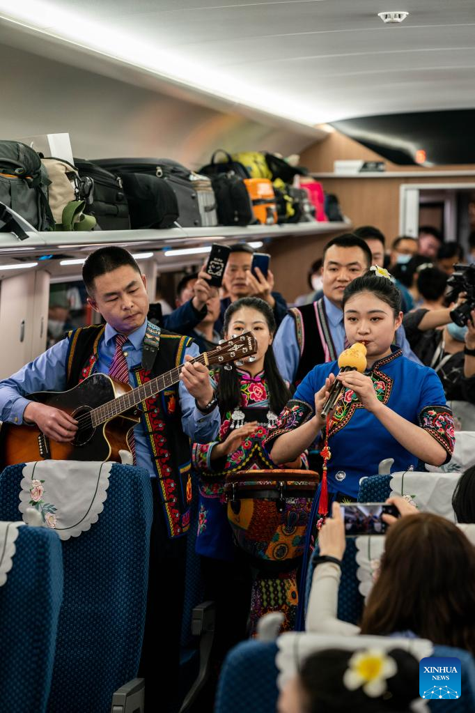 An art performance is staged aboard the first cross-border passenger train from Kunming, southwest China's Yunnan Province to the Lao capital Vientiane on April 13, 2023. The China-Laos Railway started cross-border passenger services on Thursday, a move that is expected to boost regional connectivity. (Xinhua/Hu Chao)