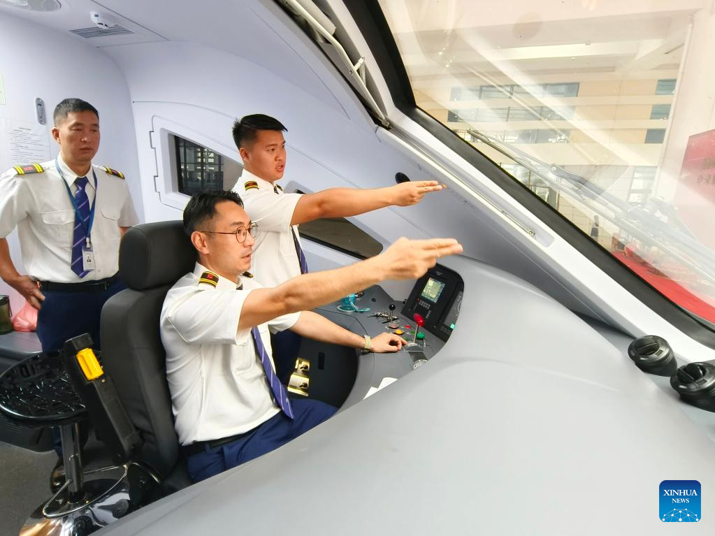 Lao and Chinese drivers of a cross-border passenger train bound for Kunming in southwest China's Yunnan Province prepare for departure from Vientiane, Laos on April 13, 2023. (Photo by Yang Yongquan/Xinhua)