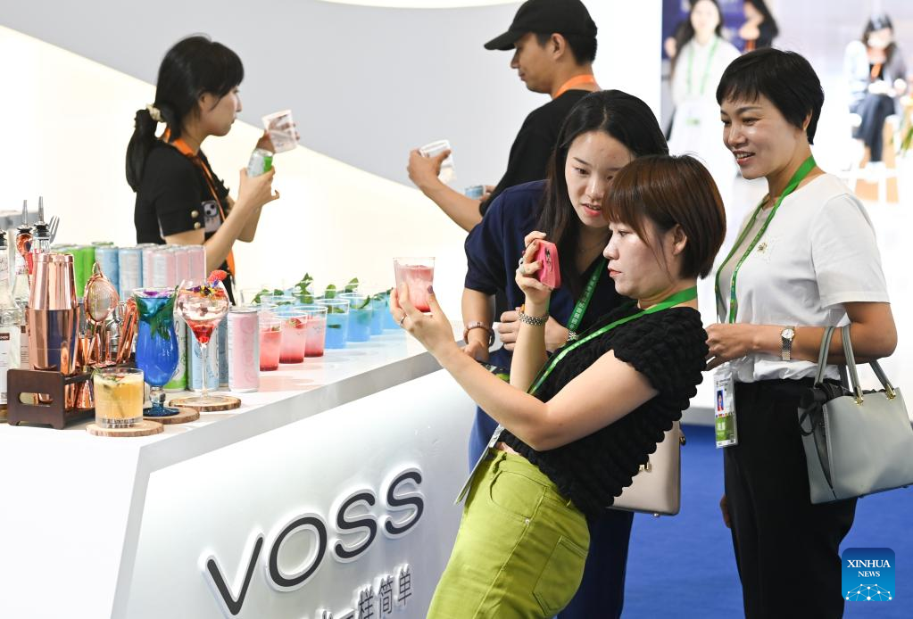 A visitor takes photos of a beverage product at the third China International Consumer Products Expo (CICPE) in Haikou, capital city of south China's Hainan Province, April 11, 2023. Various food and beverage products from around the world are showcased during the expo held from April 10 to 15. (Xinhua/Yang Guanyu)