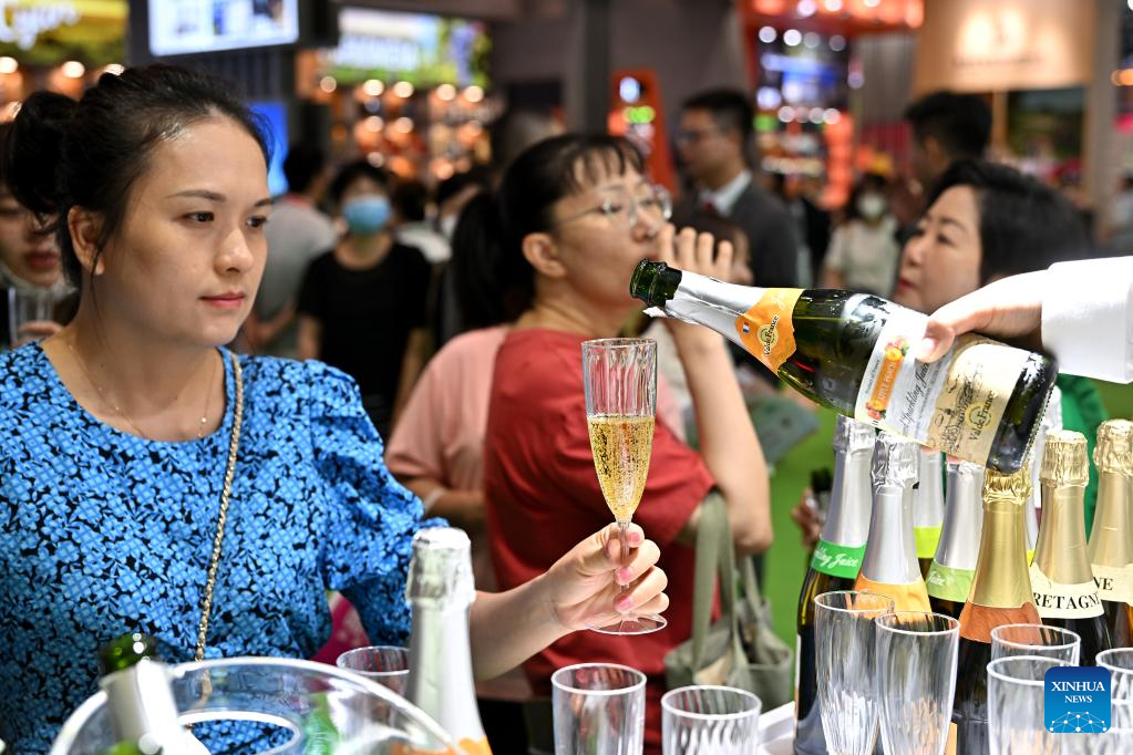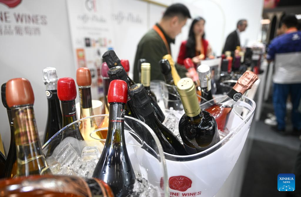 Bottles of wine are displayed in the Italian Company Pavilion at the third China International Consumer Products Expo (CICPE) in Haikou, capital city of south China's Hainan Province, April 11, 2023. Various food and beverage products from around the world are showcased during the expo held from April 10 to 15. (Xinhua/Pu Xiaoxu)