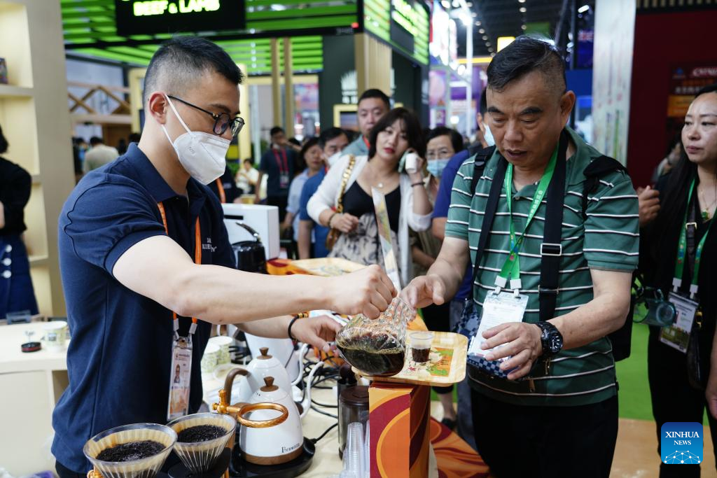 Visitors line up to taste Jamaica Blue Mountain Coffee at the third China International Consumer Products Expo (CICPE) in Haikou, capital city of south China's Hainan Province, April 12, 2023. Various food and beverage products from around the world are showcased during the expo held from April 10 to 15. (Xinhua/Fan Yuqing)
