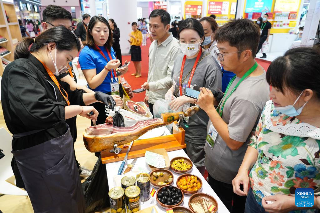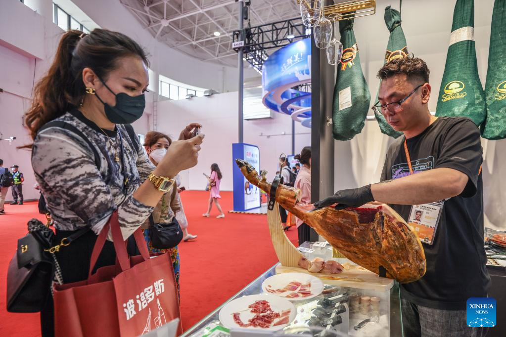 Visitors taste food from Spain at the third China International Consumer Products Expo (CICPE) in Haikou, capital city of south China's Hainan Province, April 12, 2023. Various food and beverage products from around the world are showcased during the expo held from April 10 to 15. (Xinhua/Fan Yuqing)