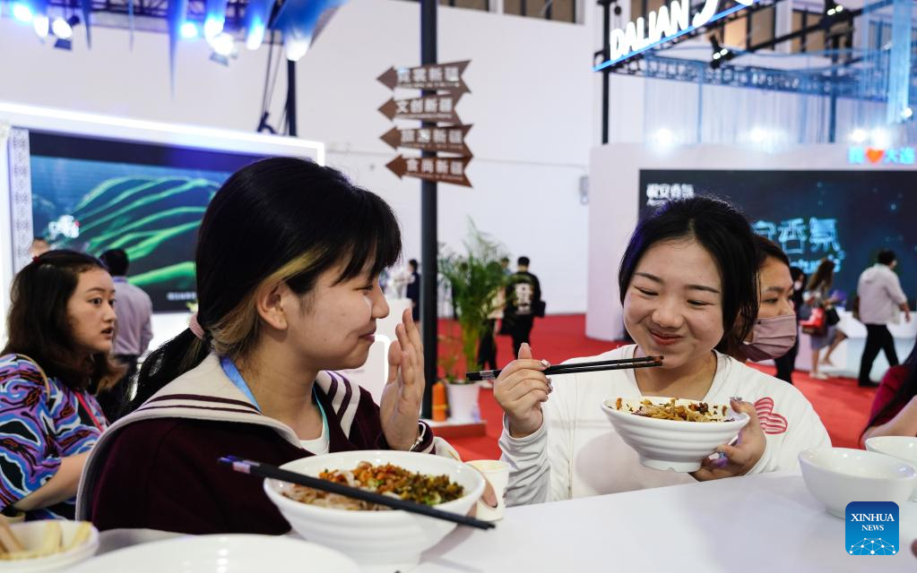Visitors taste food from northeast China's Liaoning Province at the third China International Consumer Products Expo (CICPE) in Haikou, capital city of south China's Hainan Province, April 12, 2023. Various food and beverage products from around the world are showcased during the expo held from April 10 to 15. (Xinhua/Zhang Liyun)