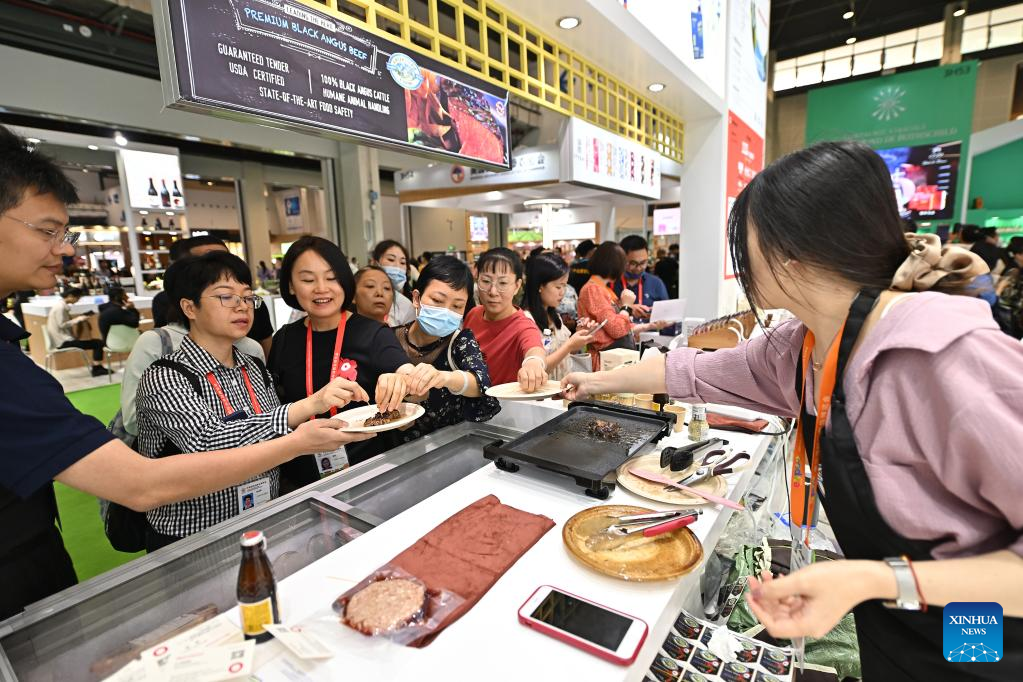 Visitors taste steaks at the third China International Consumer Products Expo (CICPE) in Haikou, capital city of south China's Hainan Province, April 12, 2023. Various food and beverage products from around the world are showcased during the expo held from April 10 to 15. (Xinhua/Li Xin)