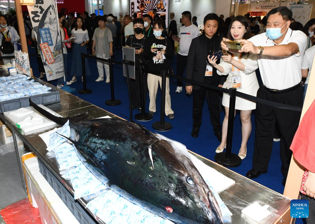 Visitors view a tuna at the third China International Consumer Products Expo (CICPE) in Haikou, capital city of south China's Hainan Province, April 12, 2023. Various food and beverage products from around the world are showcased during the expo held from April 10 to 15. (Xinhua/Yang Guanyu)