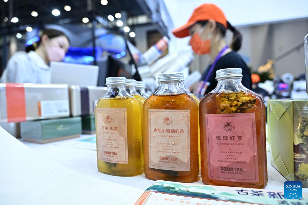 Tea products are displayed at the third China International Consumer Products Expo (CICPE) in Haikou, capital city of south China's Hainan Province, April 12, 2023. Various food and beverage products from around the world are showcased during the expo held from April 10 to 15. (Xinhua/Li Xin)