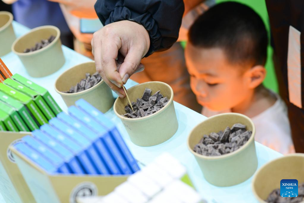 Visitors taste chocolates at the third China International Consumer Products Expo (CICPE) in Haikou, capital city of south China's Hainan Province, April 12, 2023. Various food and beverage products from around the world are showcased during the expo held from April 10 to 15. (Xinhua/Wang Zecong)