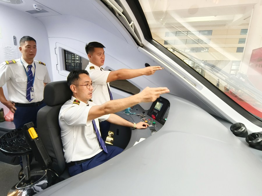 Lao and Chinese drivers of a cross-border passenger train bound for Kunming in southwest China's Yunnan Province prepare for departure from Vientiane, Laos on April 13, 2023. (Photo by Yang Yongquan/Xinhua)
