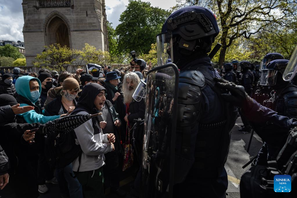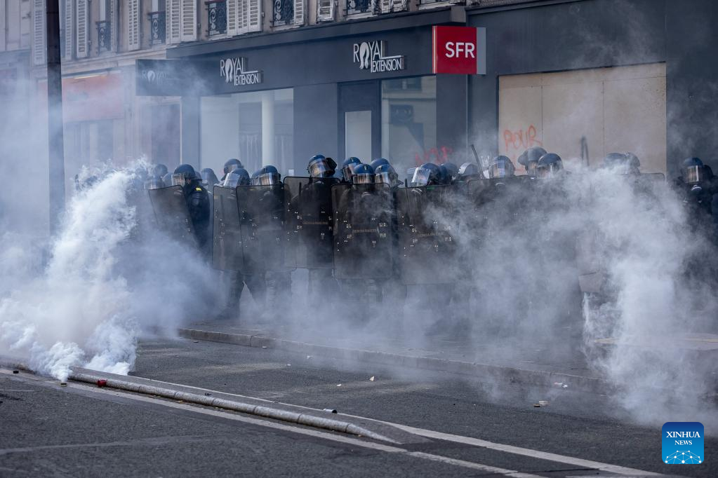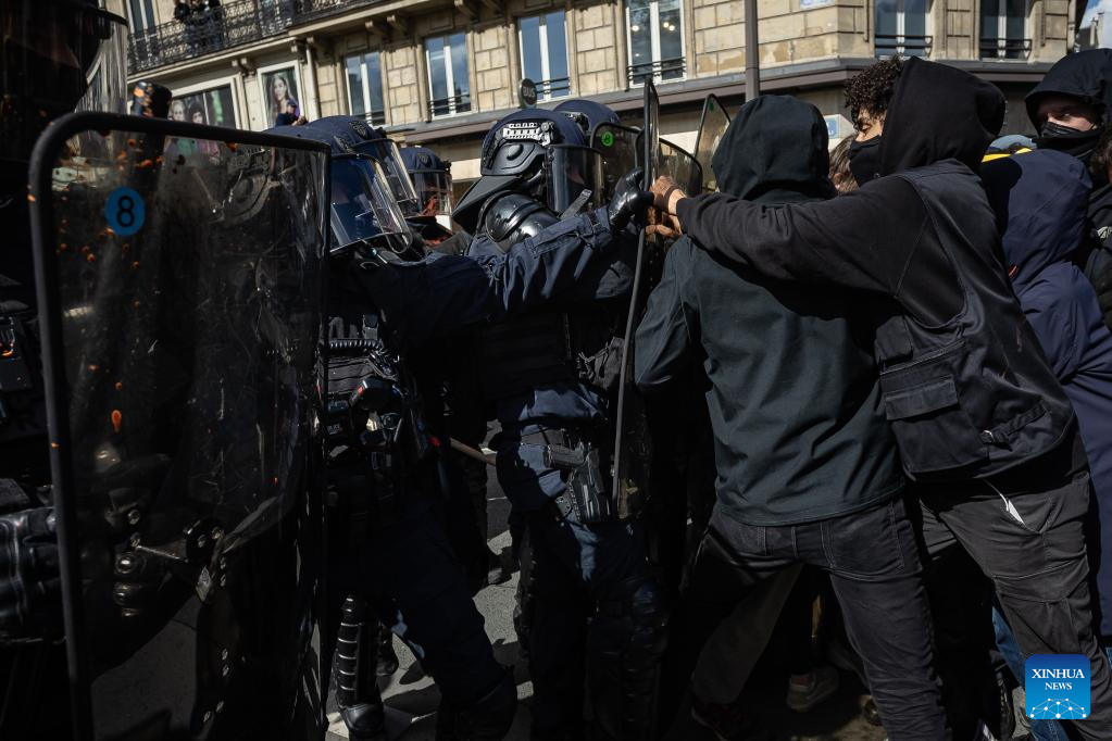 Protesters confront French gendarmes and CRS riot police during a demonstration against a pensions reform plan in Paris, France, on April 13, 2023. Around 380,000 people participated in the 12th nationwide general mobilization organized by the unions against the government's pension reform plan, the French Interior Ministry said on Thursday. (Photo by Aurelien Morissard/Xinhua)