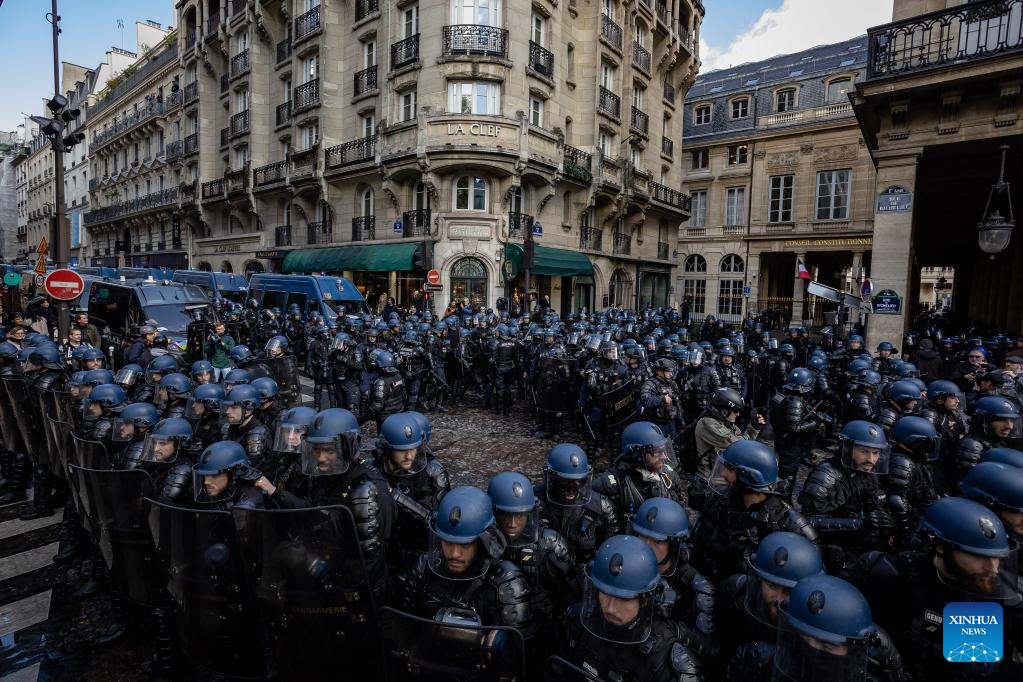 French gendarmes and CRS riot police stand in position in front of the Constitutional Council during a demonstration against a pensions reform plan in Paris, France, on April 13, 2023. Around 380,000 people participated in the 12th nationwide general mobilization organized by the unions against the government's pension reform plan, the French Interior Ministry said on Thursday. (Photo by Aurelien Morissard/Xinhua)