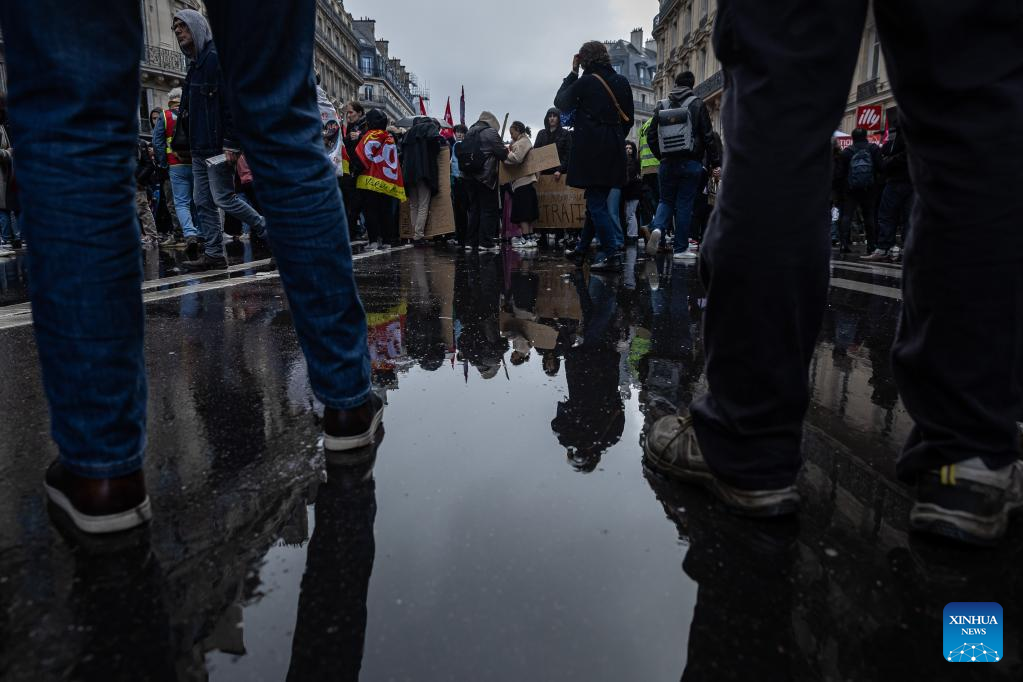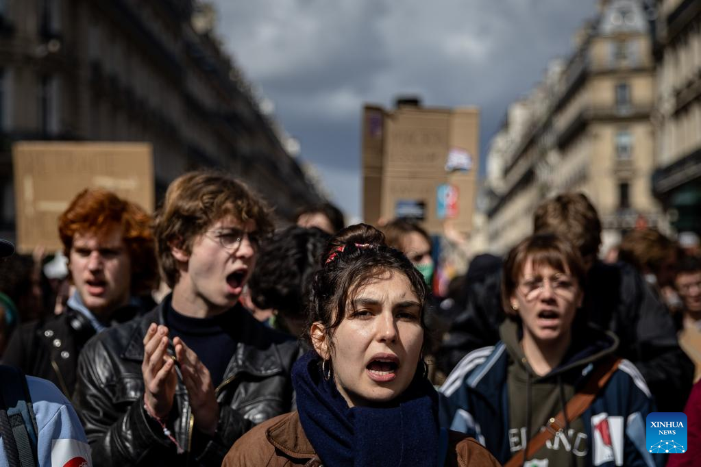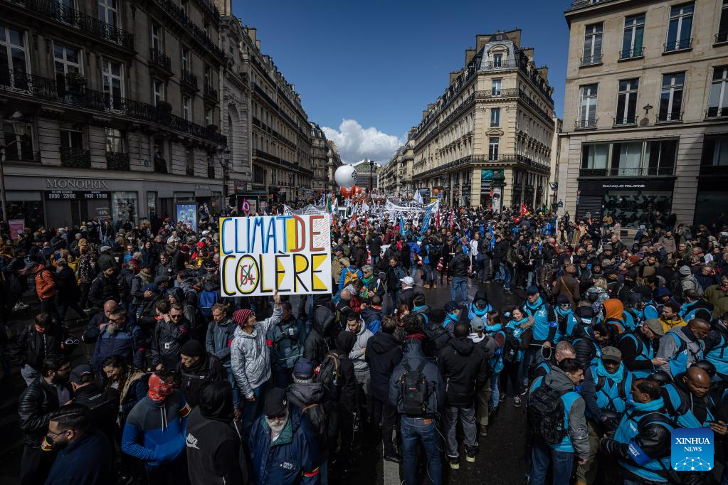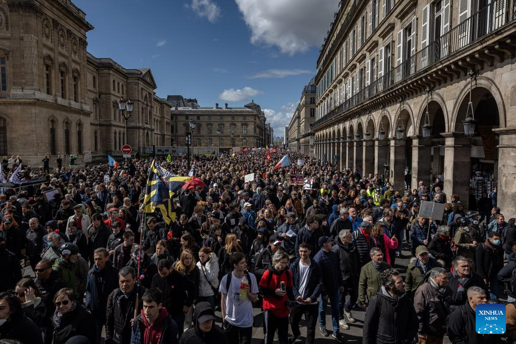 People participate in a demonstration against a pensions reform plan in Paris, France, on April 13, 2023. Around 380,000 people participated in the 12th nationwide general mobilization organized by the unions against the government's pension reform plan, the French Interior Ministry said on Thursday. (Photo by Aurelien Morissard/Xinhua)