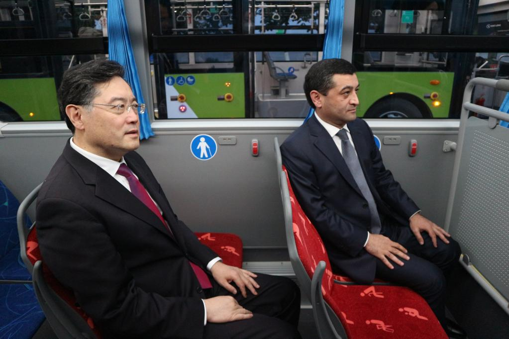 Visiting Chinese State Councilor and Foreign Minister Qin Gang (L) and Acting Minister of Foreign Affairs of Uzbekistan Bakhtiyor Saidov board a Chinese-made new energy bus in Tashkent, Uzbekistan, on April 12, 2023. (Chinese Embassy in Uzbekistan/Handout via Xinhua)