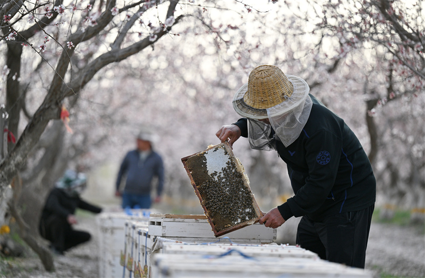 Beekeepers have become busier since bee reproduction and production of bee products started with the local forestry and fruit industry entering the flower season and pollination period in the Bayingolin Mongolian Autonomous Region of northwest China's Xinjiang Uygur Autonomous Region.