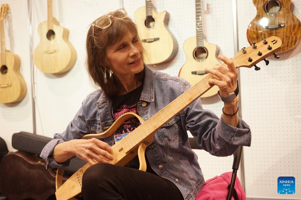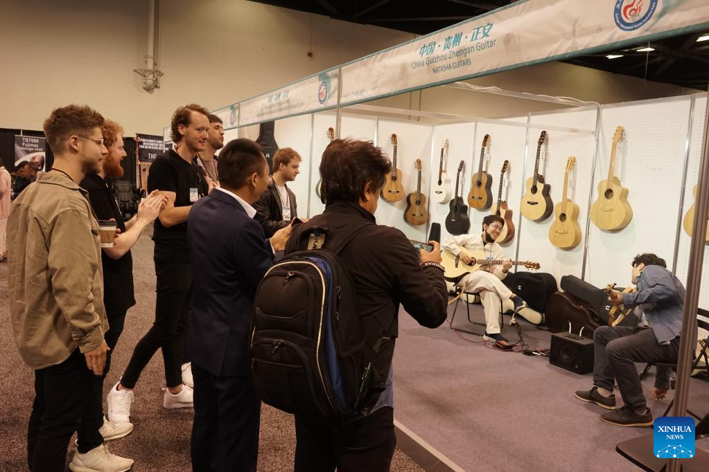 A convention goer visits the exhibition area of Chinese companies from Zheng'an county in southwest China's Guizhou province during the 2023 National Association of Music Merchants (NAMM) show at Anaheim Convention Center in Anaheim, California, the United States, on April 13, 2023. China-made musical instruments are taking the limelight at an ongoing music industry exhibition in Southern California, attracting lots of attention and recognition from overseas customers and distributors. (Photo by Zeng Hui/Xinhua)