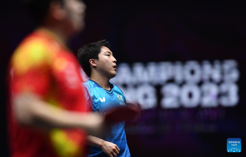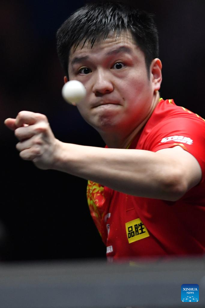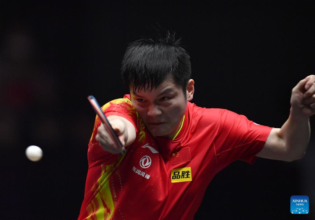 Fan Zhendong of China hits a return during the men's singles semifinal match between Fan Zhendong of China and Lim Jonghoon of South Korea at the WTT Champions Xinxiang 2023 in Xinxiang, central China's Henan Province, April 14, 2023. (Xinhua/Li Jianan)